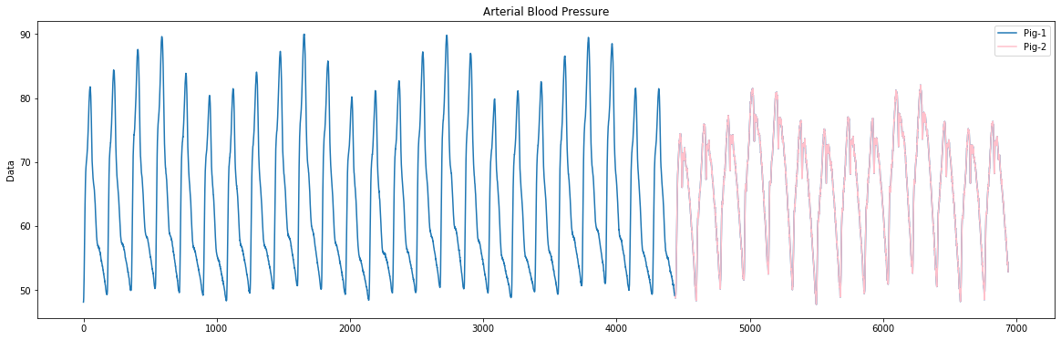 The figure above shows how we concatenate the arterial blood pressure data from two different pigs. The arterial blood pressure data from 0 to 4440 and represented by blue come from pig-1. The rest of the data, that are between 4441 and 6939 and represented by pink, come from pig-2. You can find the visualization code for this dataset in this section.