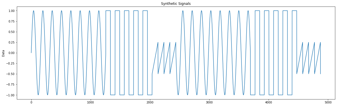 Our second sample dataset is a synthetic dataset, simulating the electrical signals generated by a function generator over a period of time. This dataset consists of three different signals: sine wave signals, square wave signals, and sawtooth signals. These signals have visually obvious differences; each has its own unique pattern. The figure [3] below illustrates the visual differences among the different waveforms.